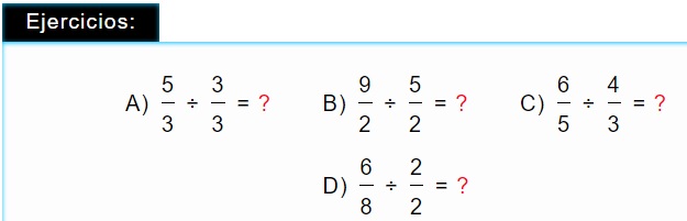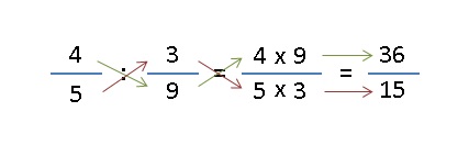 Para dividir dos o más fracciones, se multiplican "en cruz". Esto es: el numerador (número de arriba) de la primera fracción por el denominador (número de abajo) de la segunda fracción, así conseguimos el numerador. Para obtener el denominador, tenemos que multiplicar el denominador (número de abajo) de la primera fracción por el numerador (número de arriba) de la segunda fracción.