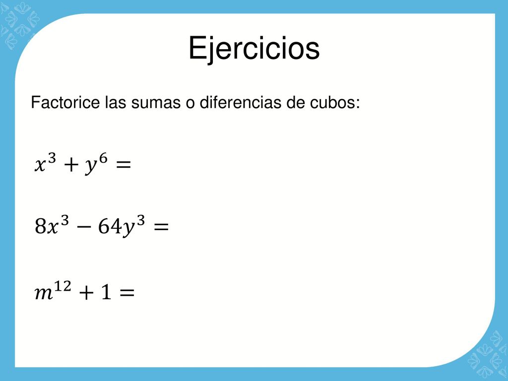 Resuelva en su cuaderno o en hojas de cuadros, tome una foto de los ejercicios y súbalos dando un clic en la imagen del pizarrón que se encuentra en la parte inferior.